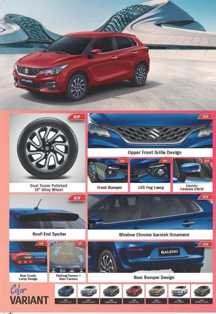 Baleno tersedia dalam 6 warna yang berbeda – Solid Fire Red, Pearl Midnight Black, Metallic Magma Gray, Metallic Premium Silver, Pearl Arctic White and Prime Stargaze Blue.