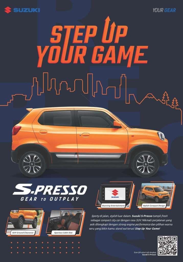 Suzuki S-Presso, anda tidak akan pernah melewatkan kehadirannya di jalan. Dengan desain yang berani dan kuda-kuda kokoh yang memancarkan energi yang hidup, S-PRESSO menghidupkan setiap tempat di kota yang dikunjunginya.