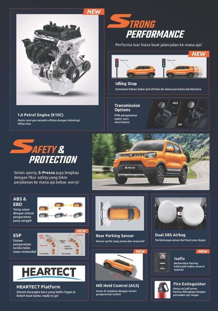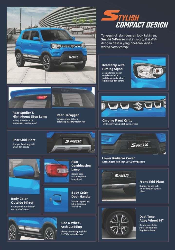 Sebagai sebuah city car, S-Presso memiliki desain yang kompak dan gaya serta menawarkan berbagai keunggulan yang membuat mobil ini value for money.